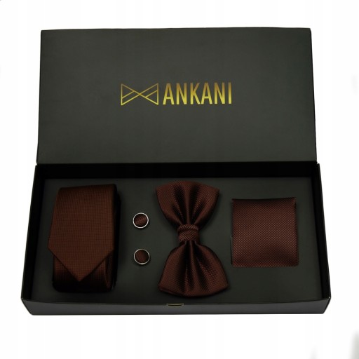 Zestaw MUCHA męska + KRAWAT + POSZETKA+ SPINKI do mankietów w kolorze brązowym