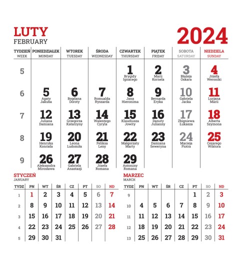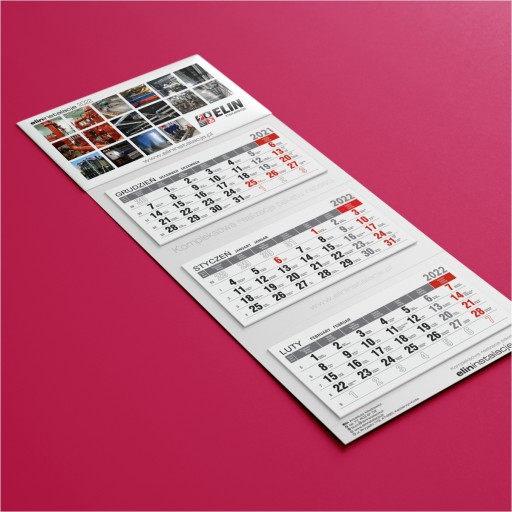 - kalendaria: 104 mm x 110 mm, offset 80g, zadruk 2/0 (czerwono-czarne)