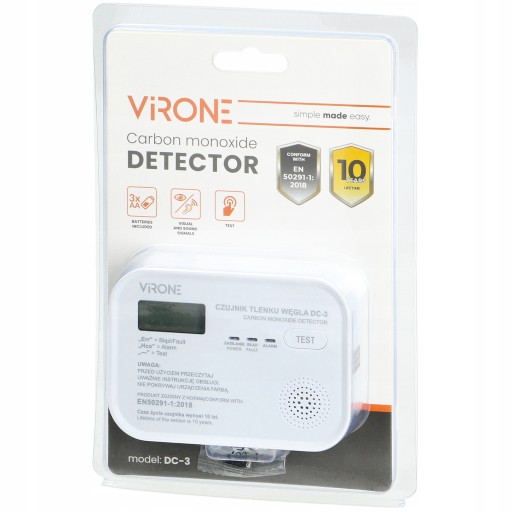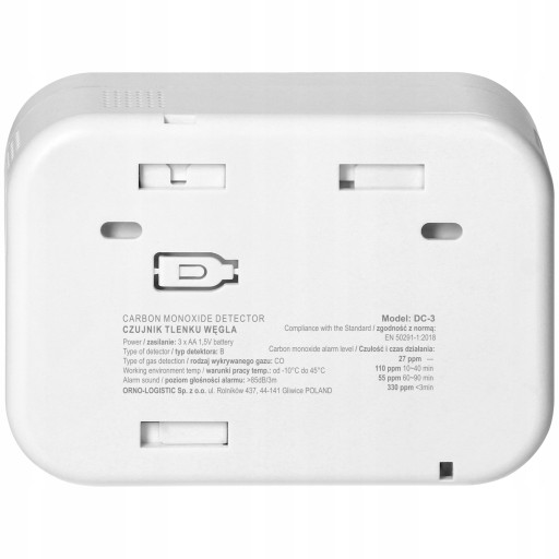Czujnik dysponuje przyciskiem TEST, który pozwala sprawdzić poprawność działania czujnika. Jest zgodny z normą EN 50291-1:2018 dla domowych detektorów tlenku węgla.