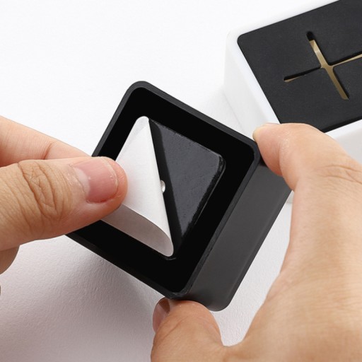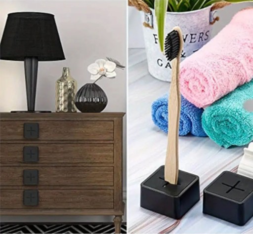 - Samoprzylepny, trzyma się każdej płaskiej powierzchni. Można przykleić go do ściany, płytek czy mebli.