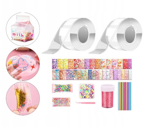2 rolki taśmy, 10 naklejek, 10 dmuchawek, 1 opakowanie brokatu, 1 opakowanie pięcioramiennej gwiazdy, 1 opakowanie granulatu cukrowego, 1 opakowanie koralików, 1 pęseta