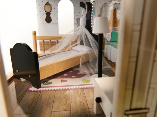 - Meble (łóżko z baldachimem materacem i poduszką, szafka nocna, 2x krzesła, stół, fortepian, lampka, parasol, kanapa, wanna, toaleta WC)