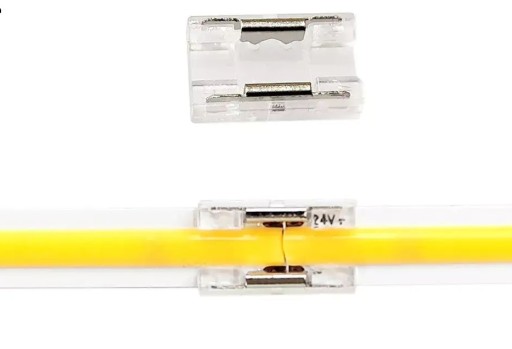 Idealnie rozwiązanie do łączenia taśm COB w jeden długi odcinek bez konieczności lutowania! Wystarczy wsunąć taśmę LED w wyznaczone miejsce i tyle! Gdy taśma LED po wsunięciu będzie luźna wystarczy docisnąć metalowe elementy do taśmy aby stykały się z polami lutowniczymi, po wykonaniu tej czynności mamy pewność, że taśma nie wysunie się ze złączki.