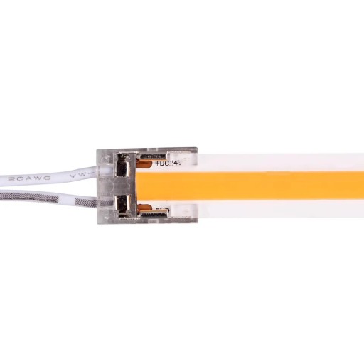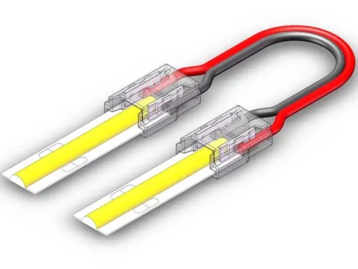 Idealnie rozwiązanie do łączenia taśm COB w jeden długi odcinek bez konieczności lutowania! Wystarczy wsunąć taśmę LED w wyznaczone miejsce i tyle! Gdy taśma LED po wsunięciu będzie luźna wystarczy docisnąć metalowe elementy do taśmy aby stykały się z polami lutowniczymi, po wykonaniu tej czynności mamy pewność, że taśma nie wysunie się ze złączki.