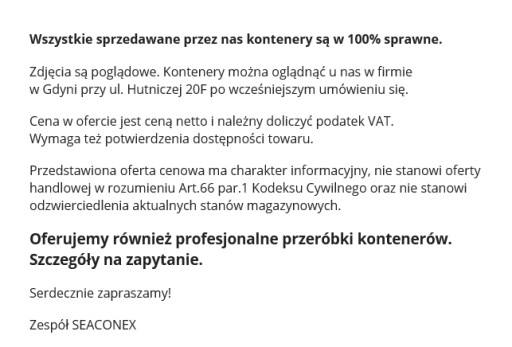 Oferta dotyczy kontenerów 20' DV o następujących parametrach: