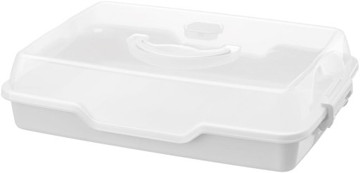 Prostokątny kształt pojemnika umożliwia przechowywanie i transportowanie w nim ciast, ciasteczek oraz wszelkich innych wypieków.