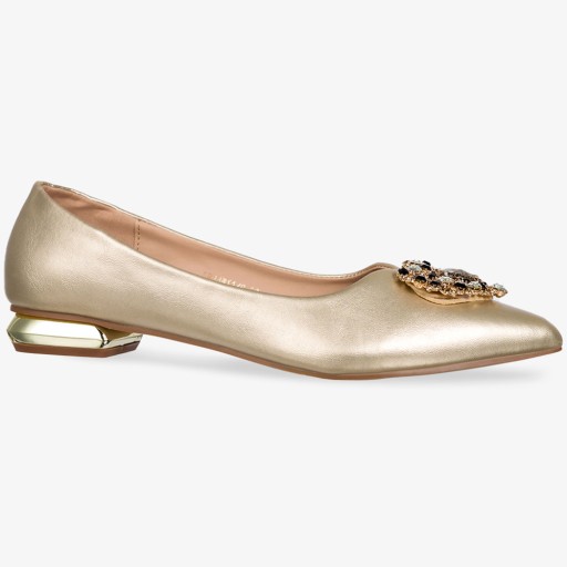 Złote baleriny damskie model ER23WX1-G zostały wykonane z wysokogatunkowej skóry ekologicznej, co gwarantuje doskonałą jakość i dopasowanie do stopy. Obuwie to łączy w sobie styl i wygodę, co czyni je popularnym wyborem dla wielu kobiet. Skórzana wkładka to dodatkowy atut, ponieważ dostarcza wyjątkowego komfortu podczas noszenia obuwia przez długi czas. Charakterystycznym elementem tej baleriny jest ozdoba w kształcie serca z kryształkami, umieszczona na czubku buta. To delikatny detal, który dodaje uroku i romantycznego akcentu. Mogą być noszona zarówno do codziennych, casualowych outfitów, jak i na bardziej formalne okazje, takie jak przyjęcia czy spotkania biznesowe. Pasują zarówno do spódniczek i sukienek, jak i do spodni, dodając im lekkości i kobiecego uroku. Baleriny dostępne na Casu to ponadczasowe, subtelne obuwie rozpieszczające kobety ogromem możliwości stylizacyjnych.