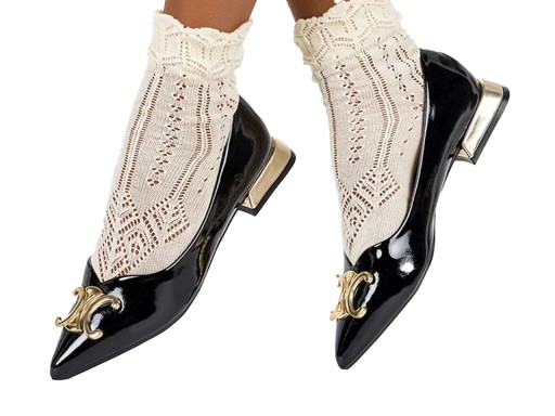Czarne baleriny damskie model ER23WX2-B zostały wykonane z wysokogatunkowej, lakierowanej skóry ekologicznej, co gwarantuje doskonałą jakość i dopasowanie do stopy. Obuwie to łączy w sobie styl i wygodę, co czyni je popularnym wyborem dla wielu kobiet. Skórzana wkładka to dodatkowy atut, ponieważ dostarcza wyjątkowego komfortu podczas noszenia obuwia przez dłuższy okres. Charakterystycznym elementem tej baleriny jest złota ozdoba umieszczona na cholewce. Mogą być noszona zarówno do codziennych, casualowych outfitów, jak i na bardziej formalne okazje, takie jak przyjęcia czy spotkania biznesowe. Pasują zarówno do spódniczek i sukienek, jak i do spodni, dodając im lekkości i kobiecego uroku. Niski, złoty obcas jest stabilny i wygodny, zapewnia lekko podwyższoną pozycję dla stopy. Szpiczasty czubek nadaje im dodatkowej finezji. To idealny wybór dla kobiet pragnących czuć się kobieco i elegancko bez konieczności noszenia wysokich obcasów. Ta nieszablonowa propozycja jest dostępna na Casu.