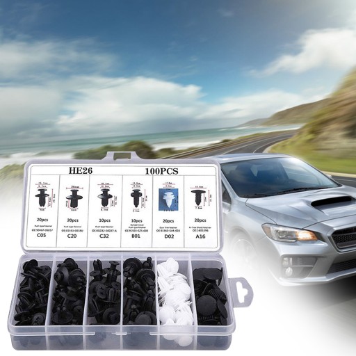 Klipsy samochodowe zostały starannie zapakowane w praktyczne pudełko z przegródkami, co pozwoli utrzymać porządek w Twoim garażu lub warsztacie. Zestaw zawiera imponującą liczbę aż 100 zacisków mocujących.
