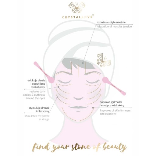 Rozświetlona, pełna blasku skóra pod oczami? Teraz jest to możliwe! Masażer pod oczy 3D z ametystem został stworzony właśnie z myślą o osobach, które potrzebują skutecznej pielęgnacji delikatnej skóry wokół oczu. Obrotowa część masująca wykonana jest z naturalnego ametystu o szlifie fasetowanym. Ma on za zadanie nie tylko podnieść walory wizualne ale również wzmocnić efekt masażu ze względu na występujące delikatne wypustki. Uchwyt, wykonany ze stali nierdzewnej w kolorze różowego złota ozdobiony jest grawerowanym logo CRYSTALLOVE. Masażer zapakowany jest w przepiękne pudełko.