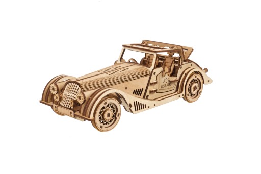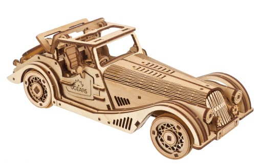 Model mini samochodu Sport Car ma funkcjonalność podwójnego silnika. Nakręć silnik sprężynowy za pomocą sześciu pełnych obrotów klucza zapadkowego znajdującego się na podwoziu modelu lub pociągnij go do tyłu po płaskiej powierzchni, zwolnij i obserwuj, jak samochód przyspiesza, jak każdy samochód zabawkowy z funkcją nakręcania. Ten drewniany model samochodu może skręcać w lewo lub w prawo poprzez regulację przednich kół lub możesz skierować go prosto i przejechać większy dystans. Gumowe opony zwiększają przyczepność i są łatwe do zamontowania i wymiany. Sport Car Rapid Mouse od UGEARS charakteryzuje się realistycznym odwzorowaniem, wybitnymi detalami wnętrza, pragmatycznie zamontowanym kołem zapasowym w bagażniku, które można zamienić z którymś z przednich kół, bocznymi drzwiami, które się otwierają, oraz ręcznym hard-topem z szyberdachem, który składa się w górę i w dół, a także klika :).
