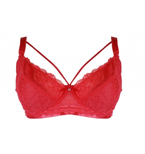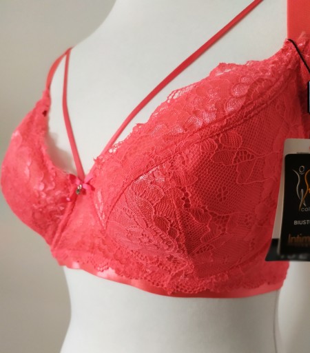 Piękny biustonosz w kolorze malinowym, z usztywnianymi miseczkami, ozdobiony koronką i paskami