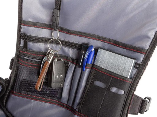 Główna komora posiada liczne dedykowane kieszenie: na myszkę, podkładkę, powerbank oraz różne peryferia i słuchawki. Natomiast przedni panel wyposażony został w organizer na akcesoria biurowe, klucze, czy pendrive.