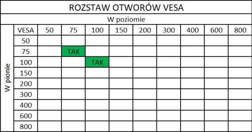 - Standard VESA: do 100mm x 100mm (max)