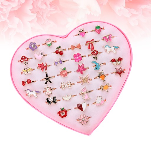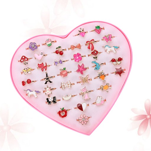 Wzory 36-częściowych pierścionków ze stopu, które sprawią, że Twoje dzieci będą zahipnotyzowane. Serce, motyl, kwiat i wiele innych kolorowych wzorów z diamentem, bardzo piękne.