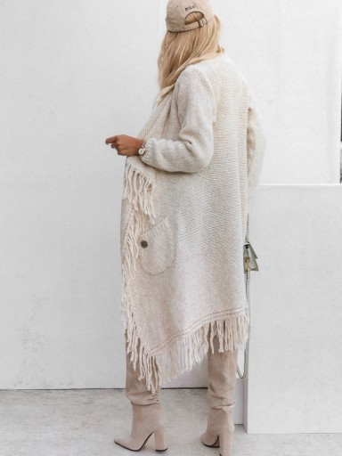 Sweterkowy kardigan z frędzlami, wykonany z wysokiej jakości przędzy.
