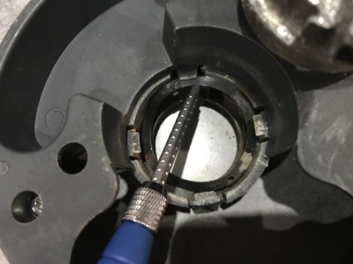 Podkładka jak widać na poniższych zdjęciach umieszczona jest od spodniej, zewnętrznej strony pojemnika, pod obrotową blokadą noży. Demontaż i montaż odbywa się za pomocą dostępnych nacedzi.