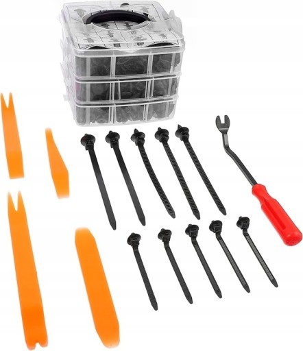 Klipsy samochodowe zostały starannie zapakowane w praktyczne pudełko z przegródkami, co pozwoli utrzymać porządek w Twoim garażu lub warsztacie. Zestaw zawiera imponującą liczbę aż 620 zacisków mocujących. Dodatkowo otrzymasz śrubokręt oraz 4 różne rodzaje specjalnych kluczy, które umożliwią Ci bezproblemowe usuwanie zużytych klipsów i montaż nowych.