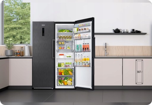 Urządzenie posiada dużą pojemność, ale pozostaje dopasowane do głębokości szafek kuchennych. Wzornictwo Cabinet Fit harmonijnie wpasuje się w Twoją kuchnię. Oferuje mnóstwo miejsca na przechowywanie cotygodniowych zakupów spożywczych i znacznie ułatwia porządkowanie produktów, byś mógł szybko znaleźć i wyjąć to, co potrzebne.