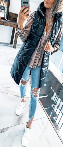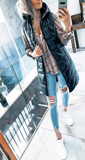 - Pikowana kamizelka zdobiona taśmą z napisami na kapturze.