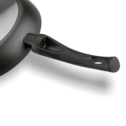Element 3: patelnia, - średnica: 28 cm, - wymiary: 46,5 x 28,5 x 6,5 cm, - wysokość rantu: 5,5 cm, - średnica pola grzewczego: 21 cm