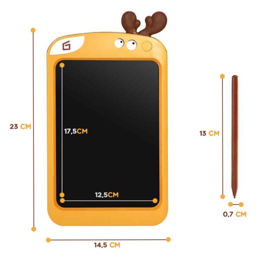Lekki i wytrzymały tablet 10.5" LCD/znikopis marki WOOPIE służący do rysowania lub nauki pisania. Można go używać zarówno w domu jak i w podróży, tworzyć, pisać, rysować i liczyć a następnie jednym przyciskiem usunąć zapis i rozpocząć zabawę od nowa. Bardzo czuła matryca umożliwia dziecku pisanie dołączonym do zestawu rysikiem dokładnie tak, jak ołówkiem. Grubość linii może być dostosowana w zależności od siły nacisku. Tablet posiada blokadę zabezpieczającą przed przypadkowym usunięciem rysunku.