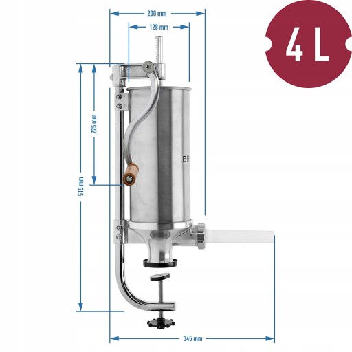 Produkt wyposażony jest w 4 lejki (z systemem odpowietrzania) w różnych rozmiarach: 14 mm, 18 mm, 21 mm, 25 mm, które są stabilnie zamontowane do nadziewarki przez dokręcaną obręcz. Cylinder wykonano ze stali nierdzewnej. W zestawie znajduje się specjalnie zaprojektowany, odporny na zginanie tłok.Nadziewarka jest niezastąpiona przy produkcji domowych kiełbas, wędlin oraz potraw z podrobów.