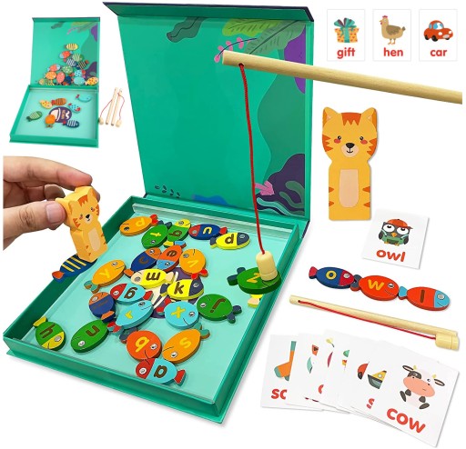 ➡️ Wszystkie rybki w zestawie są dwustronne. Na odwrocie znajdują się literki, dzięki czemu można je wyłowić i układać z nich proste słówka wg obrazków lub własne w j. polskim.