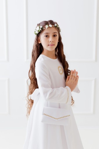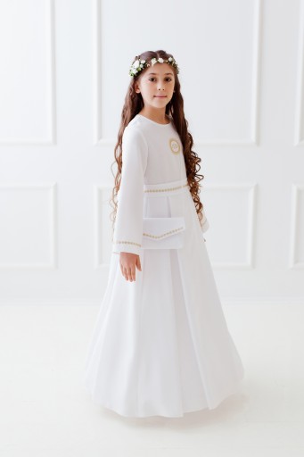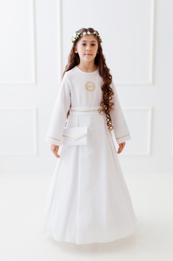 Sukienka odcinana w pasie, dół delikatne zakładki, długi rękaw. Wyhaftowana złota hostia. Rękaw oraz pasek wykończony delikatnymi złotymi kwiatkami. Z tyłu kokarda do wywiązania. Halka z tiulem od pasa (z możliwością włożenia koła). Pod sukienkę sugerujemy założyć podkoszulek na ramiączka. Hostia i kwiatki mogą być w kolorze srebra.