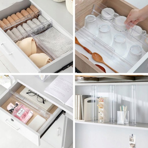 Rozszerzalny i regulowany: obie przegrody szuflady przegrody można rozszerzyć na zewnątrz. Regulowane przegródki do szuflad pomagają uporządkować przedmioty i utrzymać porządek w szufladach przez cały czas.