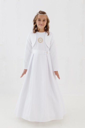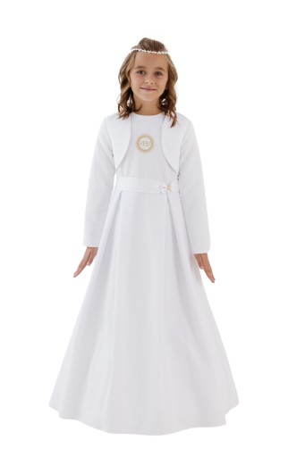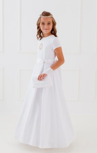 Prosta, elegancka sukienka odcinana w pasie, dół delikatne zakładki. Z tyłu pasek satynowy do wywiązania na kokardę. Halka z tiulem wszyta od pasa z możliwością włożenia koła (koło otrzymują Państwo gratis). Góra sukienki z wyhaftowaną hostią w kolorze srebrnym lub złotym.