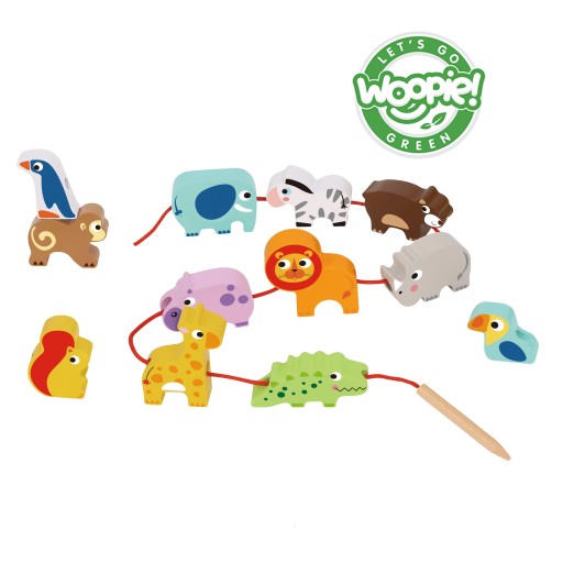 ⏩Klocki Koraliki Do Nawlekania Zwierzęta Safari ZOO od marki WOOPIE z serii GREEN to idealna zabawka do rozwijania umiejętności manualnych i nie tylko u dziecka. Przeplatanka dla dzieci utrzymana została w motywie ZOO Safari.