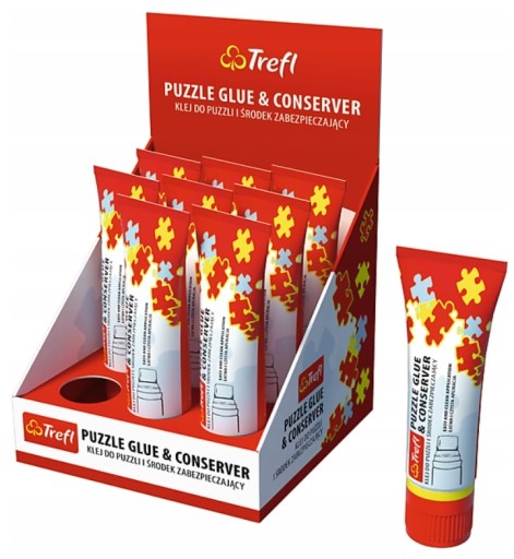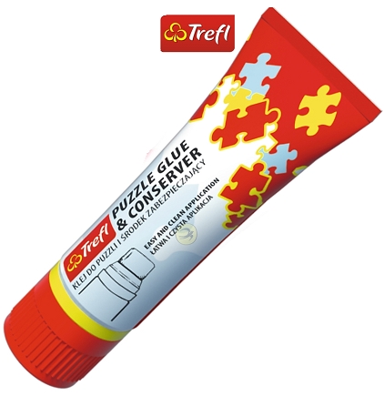 Klej w tubce z gąbką do łatwej i czystej aplikacji to środek konserwujący i klej do puzzli w jednym. Połączone za jego pomocą puzzle można z łatwością przenieść, postawić lub powiesić a ochronna powłoka zabezpiecza je przed zanieczyszczeniami. Rozprowadź klej równomiernie na całej powierzchni z obrazkiem. Zostaw do wyschnięcia i gotowe!