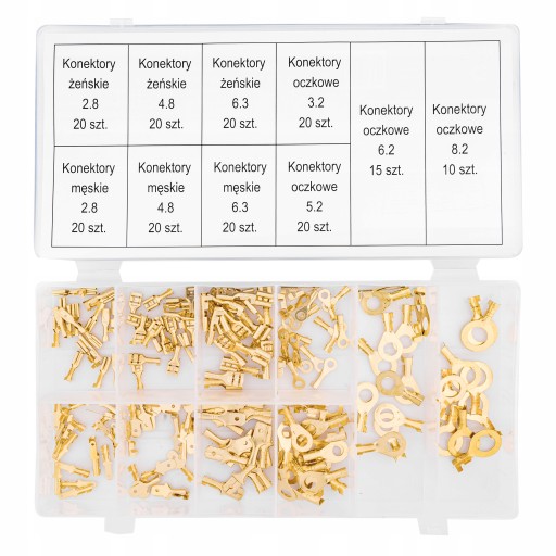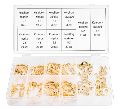 Zestaw zapakowany jest w pudełko plastikowe, posegregowane rozmiarami, przeźroczyste- dzięki czemu łatwo skontrolujesz ilość konektorów.