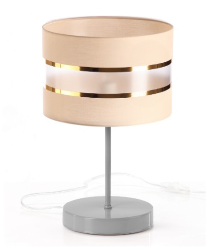 Nowoczesna lampa z beżowym abażurem w złote paski