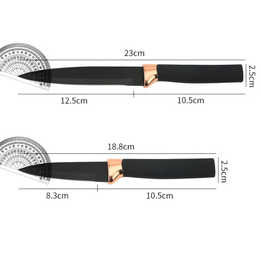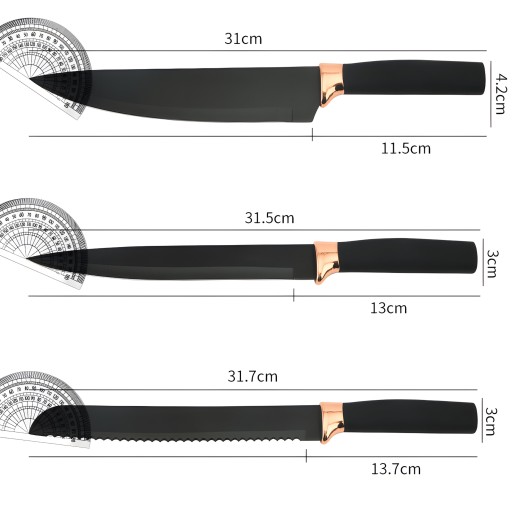 Noże wyróżniają się nie tylko swoją funkcjonalnością, ale również eleganckim designem, który doskonale komponuje się z różnymi stylami dekoracji kuchennych. Ich estetyczny wygląd sprawia, że stają się nie tylko praktycznymi narzędziami kuchennymi, ale także ozdobą Twojej kuchennej przestrzeni. Są idealnym wyborem dla tych, którzy cenią zarówno funkcjonalność, jak i estetykę. Czarny kolor i wykończenia w odcieniach różowego złota nadają nożom wyjątkowo elegancki charakter.