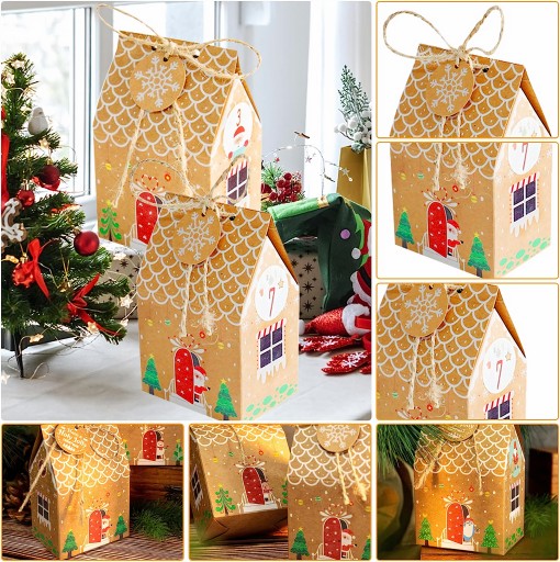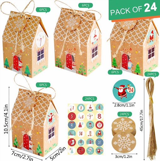 ⭐Zestaw składa się z 24 szt. kartonowych domków z kolorowym nadrukiem, sznura, zawieszek oraz okrągłych naklejek z motywem świątecznym!⭐