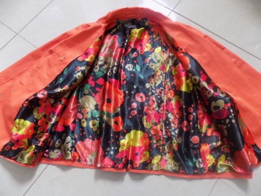 PER UNA PŁASZCZYK NA KOLOROWEJ PODSZEWCE JAK NOWY,rozmiar 16(L),dł całkowita 67cm,szer 55cm,dł ękawa od szyi (3/4)56cm,w środku na całości podszewka,POLECAM