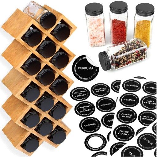 ⭐Bambusowy⭐18 szklanych słoiczków⭐72 naklejki⭐Estetycznie wykonany⭐