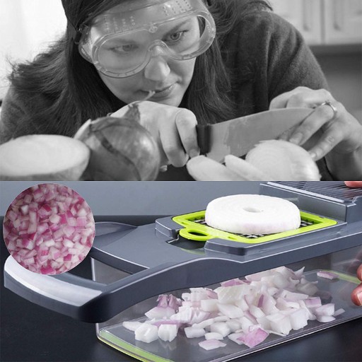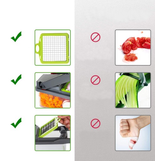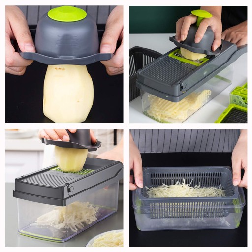Wszystkie ostrza w nasadkach są bardzo ostre i zostały wykonane ze stali nierdzewnej. Krojenie czy szatkowanie odbywa się bez większego trudu, nawet z twardszymi produktami jak cebula czy marchew. Pozostałe elementy urządzenia wykonane są z tworzyw sztucznych wysokiej jakości zaprojektowane w taki sposób, aby nie dopuścić do skaleczeń. Szatkownica pomaga również zadbać o porządek i zorganizowanie w kuchni.