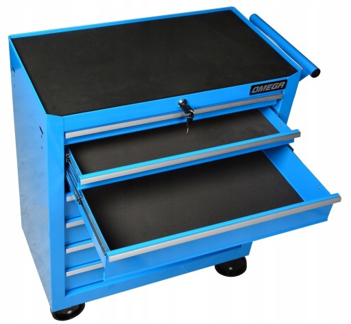 Szafka wyposażona jest centralny zamek zamykający wszystkie szuflady, w pełni wysuwane na łożyskach kulkowych. Każda szuflada wyłożona jest antypoślizgową matą.