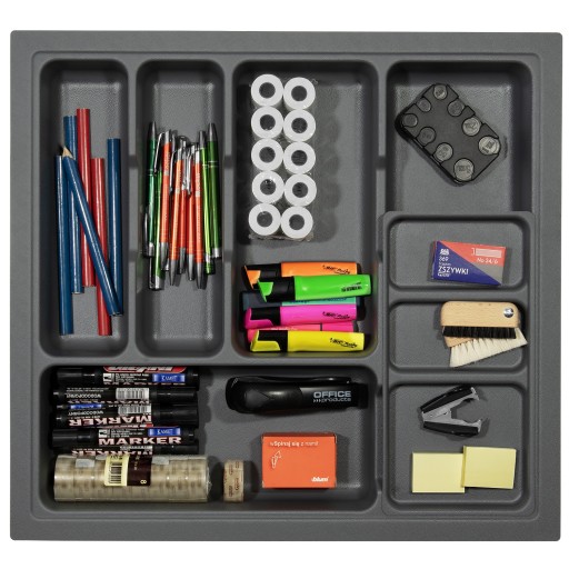 Organizer składa się z dwóch elementów: wkładu i mobilnej nakładki, którą można umieścić w trzech różnych miejscach na wkładzie. Rozmiary organizera przystosowane są do szuflad o wymiarach 600×490mm. Jego grubość to 2mm – wkład jest bardzo wytrzymały i odporny na uszkodzenia. Organizer UNIVERSAL wyróżnia się głębokimi przegródkami – wysokość wkładu wynosi 56,5mm.