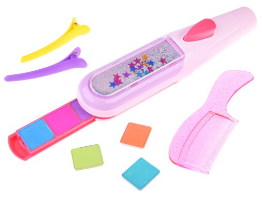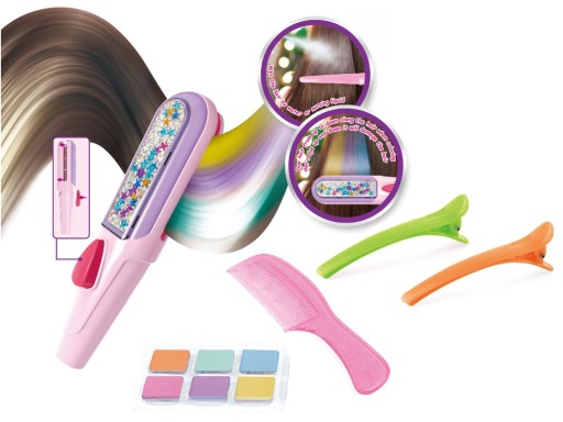 Zestaw zawiera wszystkie niezbędne akcesoria dzięki którym można stworzyć nową kolorową fryzurę. Znajdziemy tutaj aż 6 kolorów kredy: fioletowy, pomarańczowy, zielony, morski, różowy, niebieski; a także grzebyk i urządzenie do nakładania koloru na włosy.