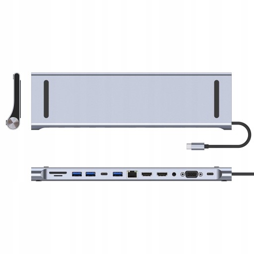 Zapewnia dostęp do dodatkowych wejść USB-C, USB 3.0, USB 2.0, slotów na karty pamięci SD i MicroSD, wyjść HDMI, VGA, wyjścia audio 3.5mm oraz gniazda sieciowego Ethernet RJ45.