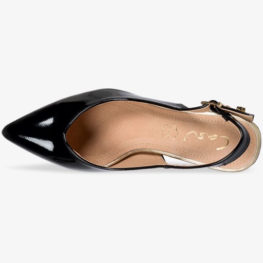 Czarne czółenka damskie model ER23WX3-BP zostały wykonane z wysokogatunkowej, lakierowanej skóry ekologicznej, co gwarantuje doskonałą jakość, wygodę i dopasowanie do stopy. Czółenka na klocku to eleganckie buty, które będą idealnym uzupełnieniem zarówno formalnych jak i casualowych stylizacji. Charakterystyczną cechą tych czółenek jest odkryta pięta, która dodaje im subtelności i lekkości. Pozwala stopom oddychać, a jednocześnie podkreśla kobiecość. Skórzana wkładka absorbuje nieprzyjemne zapachy i pochłania wilgoć. Delikatna biżuteryjna ozdoba przy zapięciu dodaje im wyrafinowanego szyku. Dodatkowym elementem tego modelu jest szeroki obcas, który gwarantuje stabilność podczas chodzenia. To doskonały wybór zarówno na spotkanie biznesowe, formalne wyjście, jak i na wieczór ze znajomymi. Dzięki uniwersalnemu designowi i wygodzie, te buty dostępne na Casu staną się nieodłącznym elementem Twojej garderoby.