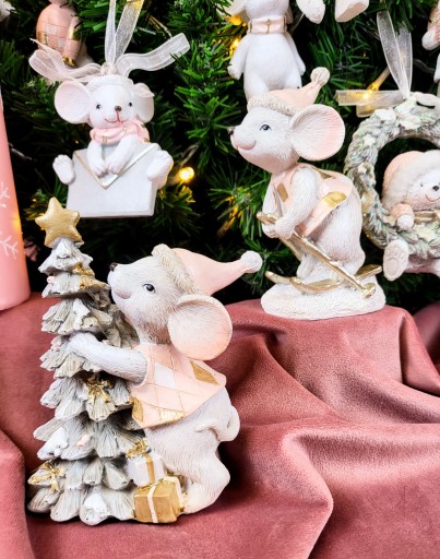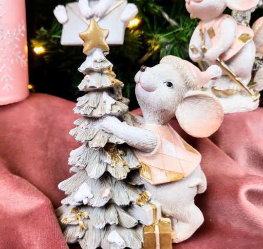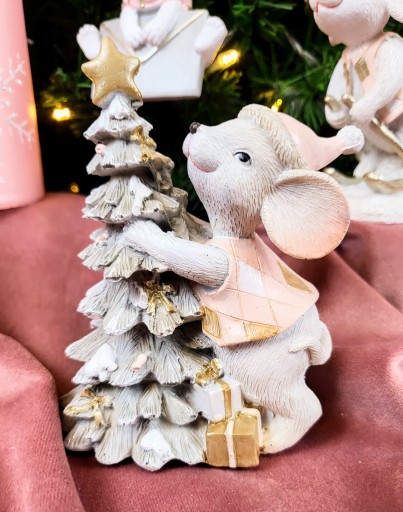 Różowa figurka mysz z choinką będzie perfekcyjnym akcentem jako ozdoba komody, stołu i w innym dowolnym miejscu.