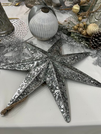 Piękna dekoracja Świąt Bożego Narodzenia, wykonana z dużą starannością, masywna o nierównej lekko połyskującej powierzchni.