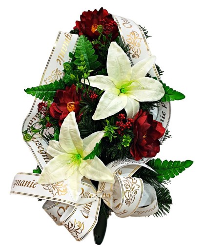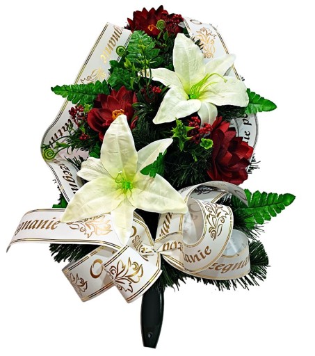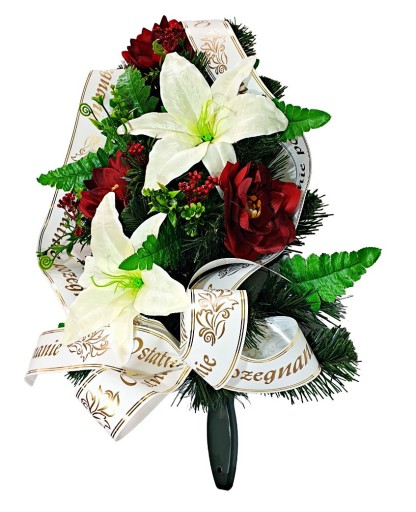 Wiązankę cechuje gęsty splot sztucznych gałązek iglastych, które tworzą estetycznie wyglądające tło dla unikalnej kompozycji kwiatów. Starannie dobrane kwiaty są niezwykle realistyczne i naturalne, dodając wiązance autentyczności i podkreślając jej uroczysty charakter.