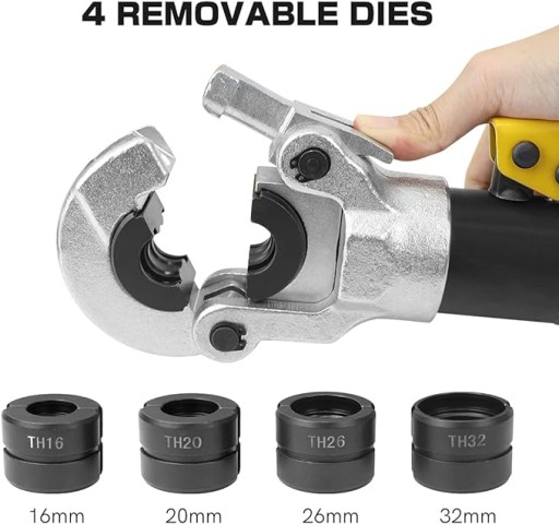 Szczypce do zaciskania rur są wyposażone w 4 wymienne szczęki o różnych rozmiarach (16 mm, 20 mm, 26 mm, 32 mm), które pasują do większości prac związanych z zaciskaniem rur. Główkę można łatwo otworzyć, a szczęki można bez wysiłku zmieniać.