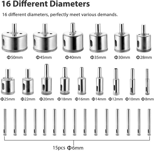 4,16 różnych ceramicznych wierteł dołączonych do tego zestawu wierteł do szkła, aby spełnić różne wymagania. Zawiera następujące średnice: 6mm, 8mm, 10mm, 12mm, 14mm, 16mm, 18mm, 20mm, 22mm, 25mm, 28mm, 30mm, 35mm, 40mm, 50mm, 16szt wierteł do otworów 14szt 6mm otwieracz do otworów